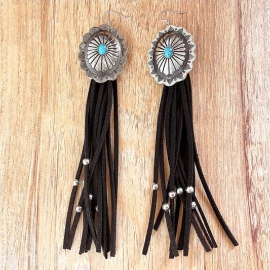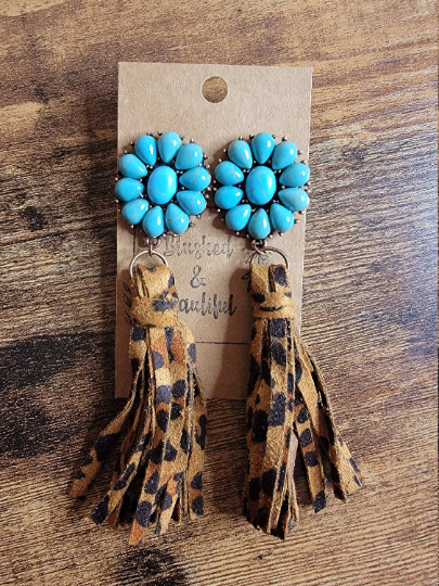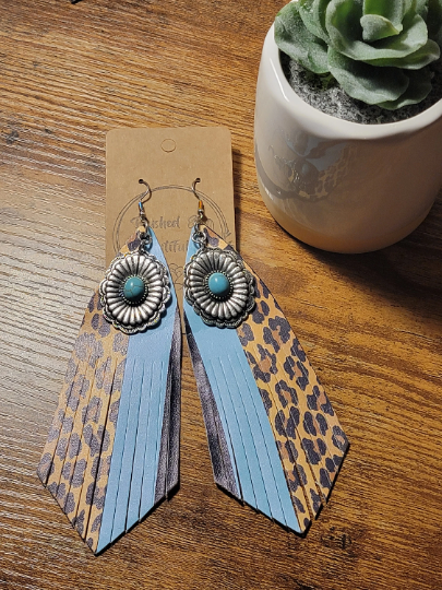 Concho Faux Shredded Leather Cow & Leopard Print Fringe Earrings