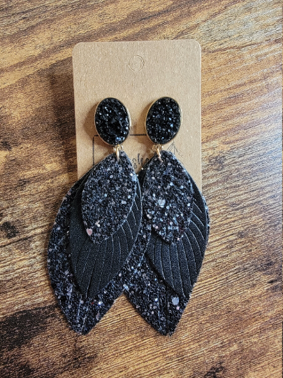 Boho Glitter Druzy Leather Leaf printed Earrings
