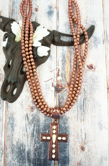 Cross Stone Beaded Multi Chain Necklace and Earrings