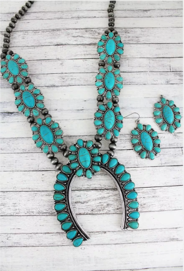 Turquoise Howlite Squash Blossom Silver Beaded Jewelry Set